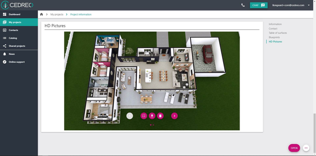 Alle Renderings eines bestimmten Grundrisses können in einer Projektgalerie gespeichert werden, auf die Sie und – wenn Sie die Unternehmen-Version haben – allen anderen Teammitglieder Zugriff haben. Die Renderings können direkt von dort heruntergeladen werden. Es ist auch möglich, Ihre 2D-Grundrisse aus Cedreo zu exportieren, entweder im JPG- oder im PDF-Format. Wenn Sie das PDF-Format wählen, können Sie die Pläne maßstabsgetreu ausdrucken.