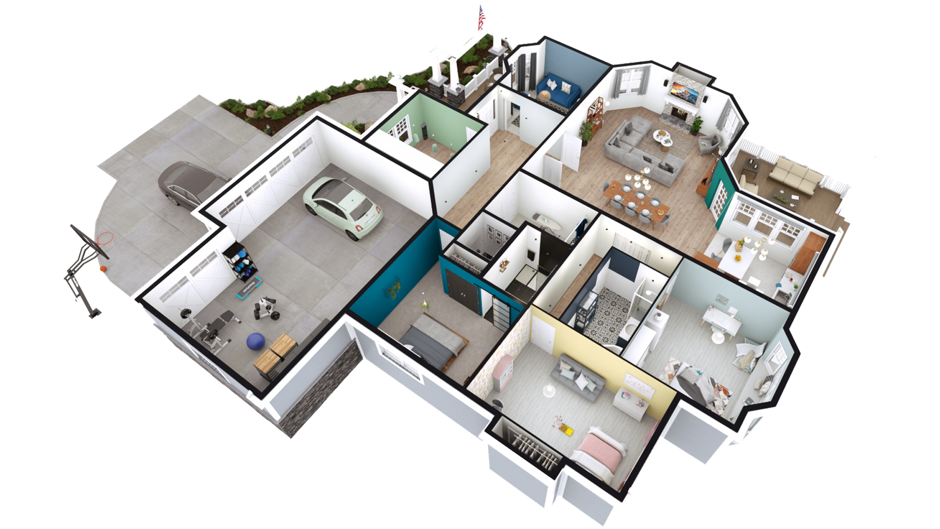 Choose from a variety of 3D views to present to your client, like a 3D floor plan top view with exterior details or an isometric 3D floor plan.